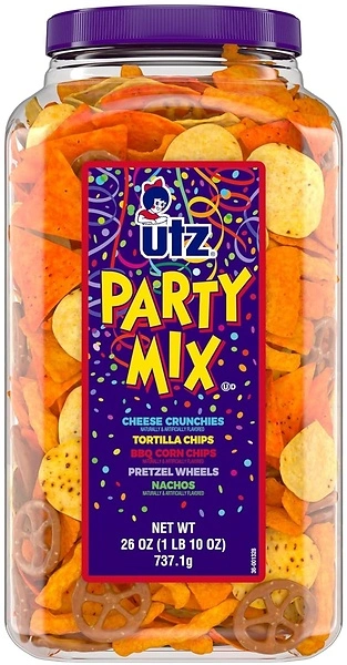 Utz Party Mix, 26 Ounce Barrel, Corn/Nacho Tortillas, Pretzels, BBQ Chipsas low as $14.09 (reg. $19.99) shipped!